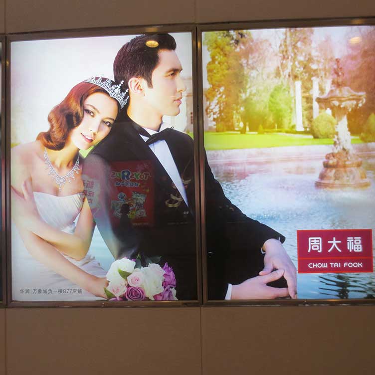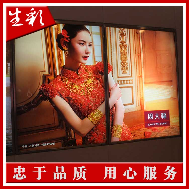 周大福(股票代号:1929)是香港上市市值最大珠宝公司,专营周大福品牌珠宝玉石金饰业务,是集原料采购、生产设计、零售服务的综合性经营企业,是中国内地及香港最著名及最具规模的珠宝首饰品牌。现深圳生彩广告与周大福珠宝强强合作,我司提供了多种灯片喷绘方案给周大福珠宝,包括UV灯片,UV刀刮布,激光冲印灯片,EPSON原装墨方案。