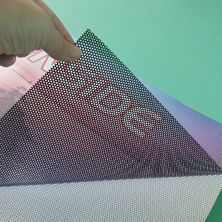 单孔透,也被称为透视贴或网孔贴,是一种高效的广告材料,它的主要材质为PVC,单孔透背面有胶,安装方便,可直接粘贴