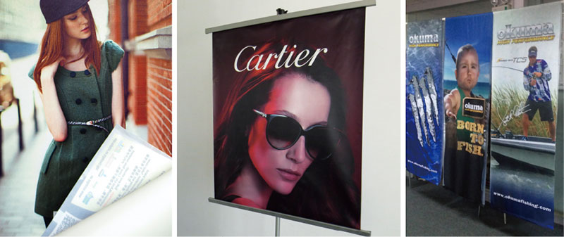 旗、刀旗、易拉宝、拉网展架、彩易展系统、快幕秀、促销台、L形展架、人像立牌、海报架等。